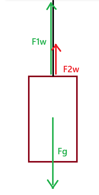När hissen accelererar uppåt tillkommer kraften F2w. Tillsammans med F1w är de större än Fg.