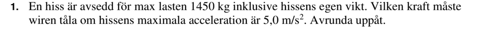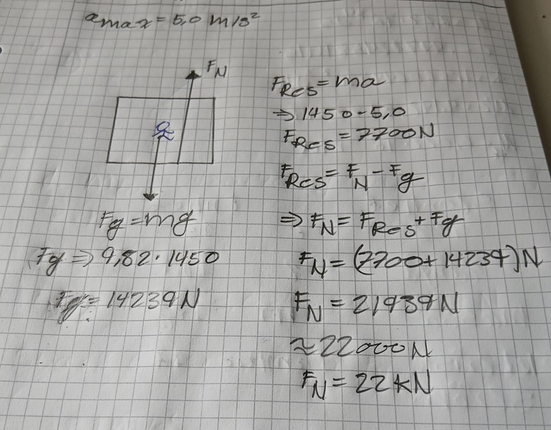 Nu säger uppgiften att den skall accelerera 5 ms-2, vilket betyder ytterligare 1450*5 N, ca 7,3 kN.