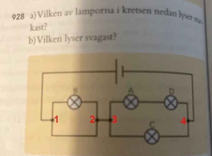 jag läste ett resonemang om att seriekopplingen var kortsluten men om man ska föra det resonemanget då är både B, A, D svagast