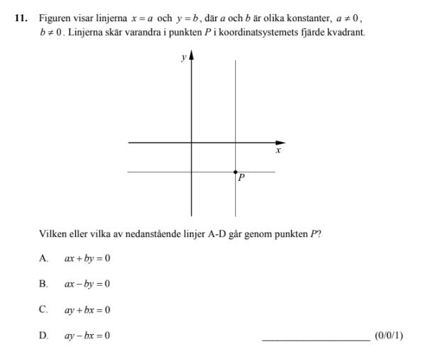 A och C får positiv lutning, och B och D får negativ lutning. Eftersom ingen av linjerna har ett m-värde tänker jag att alla måste skära origo och därför måste rätt svar vara B eller D, men jag vet inte vilken av dem det ska vara.