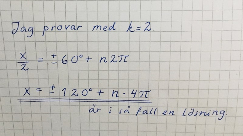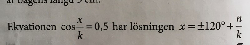 Vilken lösning har ekvationen cos (x/k) = 0,5?