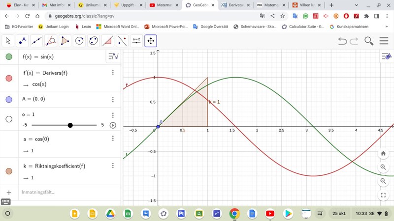 Vilken lutning har tangenten till y=sinx i punkten (0,0)