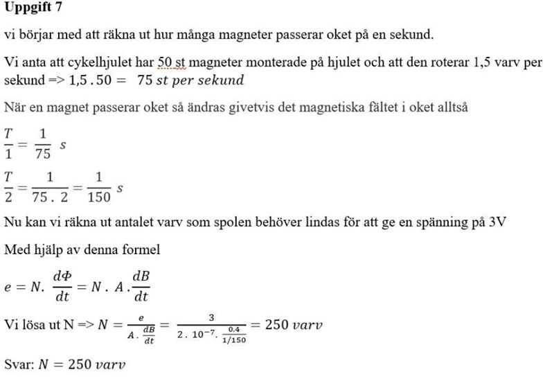 "Cykellysen är ett ständigt bekymmer eftersom de batteridrivna kostar i batteri inköp och dynamos slirar i blött väder. Dessutom låter de ganska mycket. Man skulle kunna montera små permanentmagneter runt hela fälgen som löper genom ett ok där en spole är monterad. Se figur. Anta att cykelhjulet har 50 stycken magneter monterade på hjulet och att hjulet roterar 1,5 varv per sekund. Varje magnet har en tvärsnittsyta på 2cm2 och ger en magnetisk flödestäthet B=0,40T. Du kan bortse från eventuella luftspalter mellan spolen och magneterna. Hur många varv behöver spolen lindas för att ge en spänning på 3V?"