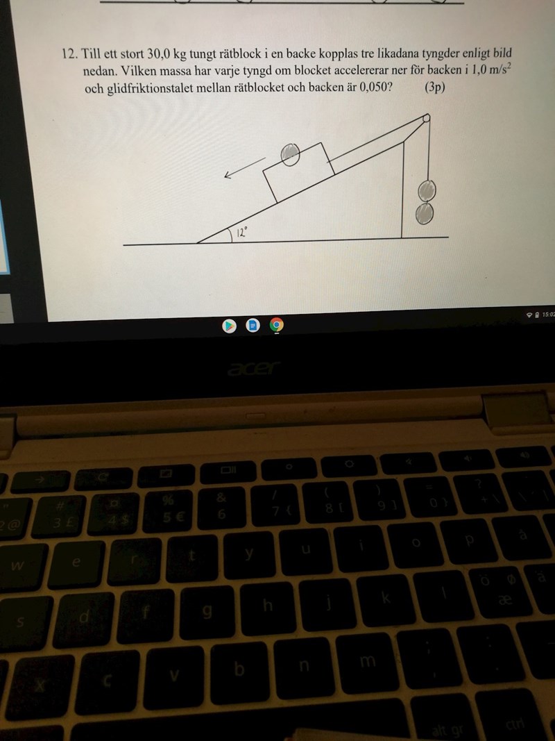 Du vet att , där är den resulterande kraften riktad nedåt längs med backen, är systemets totala massa, dvs och accelerationen m/s2