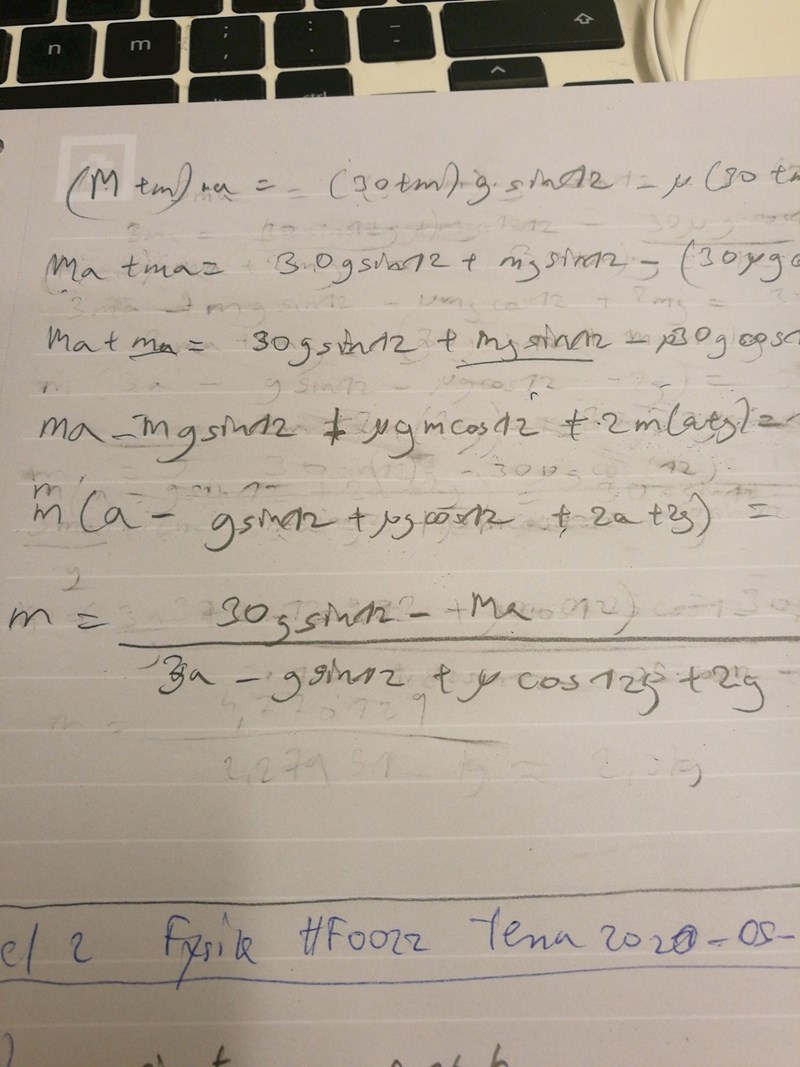 0,80 kg är precis det facit kom fram till. Men jag har som sagt den där algebran : '' 3ma= (30+m)*g*sin12-my(30+m)*g*cos12-2mg'' och den kommer ifrån ma= (30+m)*g*sin12-my*(30+m)*g*cos12-2mg