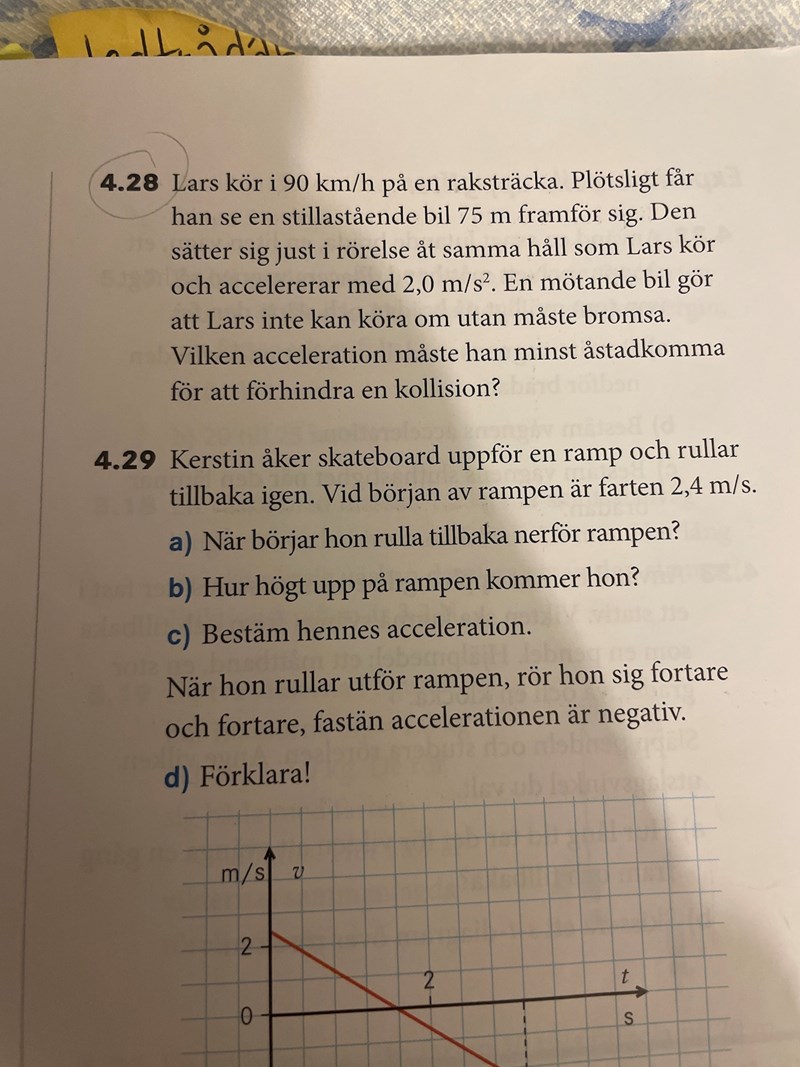 När t = 0 så har Lars bil hastigheten 90 km/h, dvs 25 m/s. Den grafen har en konstant negativ lutning som motsvarar den sökta accelerationen.