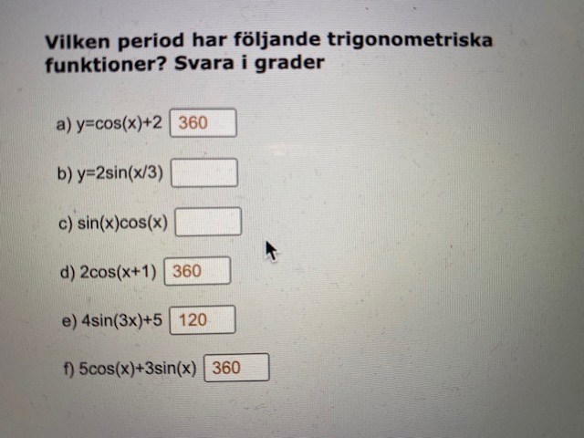 perioden är det som är längde i x-led tills ursprungsläget, man ska alltså dividera 360 grader med det som står framför x.
