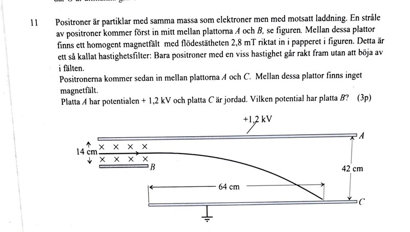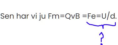 Ja precis. Okej varför stämmer ej det riktigt? Är ej magnetiska kraften lika med elektriska kraften eller gäller det om positronen står bara still och ej accelererar uppåt eller nedåt? Jag menar Fe=U*Q/d