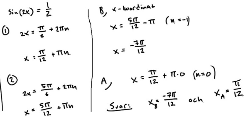 A borde vara pi/12, B -7pi/12 men nu är jag så sömnig så det kan bli fel.