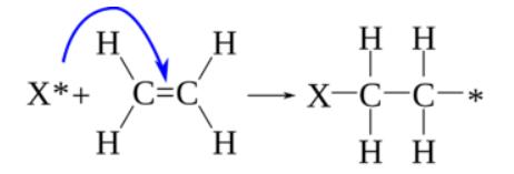 Hej, jag håller på och läser om additionspolymerisation. Man brukar dela upp additionspolymerisationer i tre steg. Steg nummer 2 heter propagering och då sker denna reaktion: