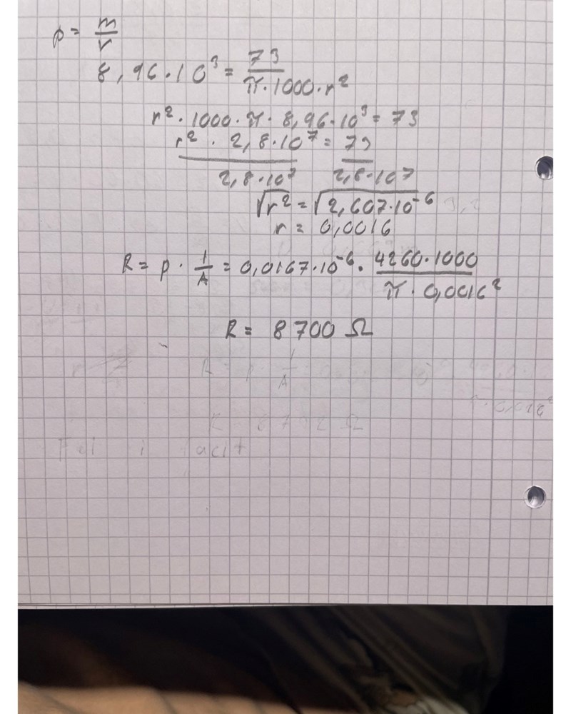 Motståndet är då R=ϱA=1,77·10-8×4260·1038,40·10-6=8976 Ω.R = \varrho \dfrac{\ell}{A} = 1,\!77\cdot 10^{-8} \times \dfrac{4260\cdot 10^3}{8,\!40\cdot 10^{-6}} = 8976 \ {\rm \Omega}.