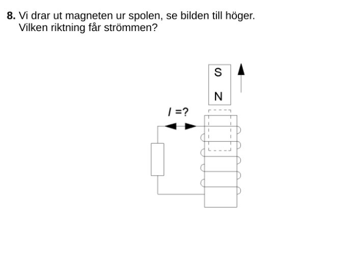 Ett fält riktat neråt från magneten lämnar spolen. Förändringen blir då att ett fält neråt avtar. Spolen vill motverka denna förändring och skapar ett fält därför ett fält neråt. Med högerhandsregeln ser vi att detta blir en ström till vänster.