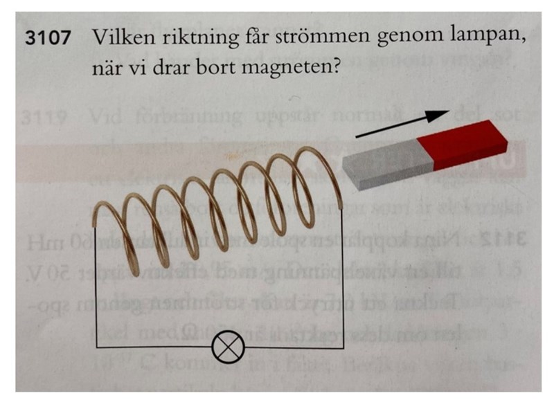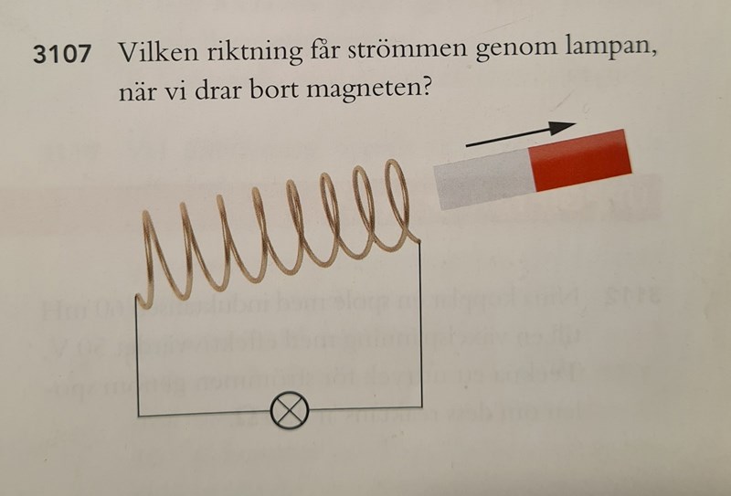 I denna uppgift har jag kommit fram till att den inducerade strömmen går från vänster mot höger, men svaret i facit anger att strömmen går från höger till vänster genom lampan. Jag är ganska övertygad på att jag svarat rätt.