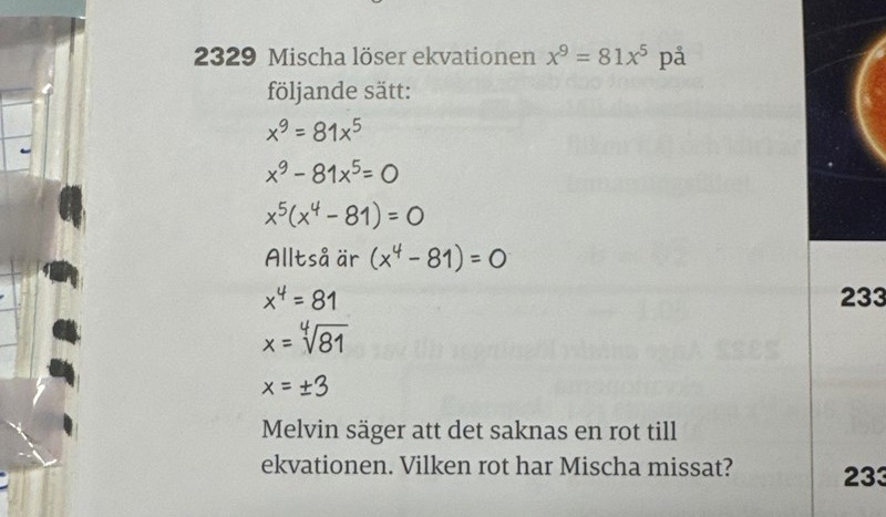 Antingen måste det inom parantesen vara lika med noll för att hela vänsterledet ska vara lika med noll, eller så måste det utanför parantesen vara lika med noll för att det ska stämma. 3^4=81 och 81-81=0 (-3)^4 = 81 återigen blir 81-81=0 Kvar blir (3^5)*0 =0 och likheten gäller. Om faktorn utanför parantesen skulle vara lika med noll, multipliceras allt innanför parantesen med noll och V.L blir 0. Likheten gäller.