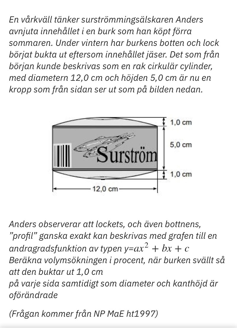 Kan du med ledning av våra bilder i tråden och genom att själv klura lite på saken komma fram till hur andragradsfunktionen hänger ihop med utbuktningen av burken?