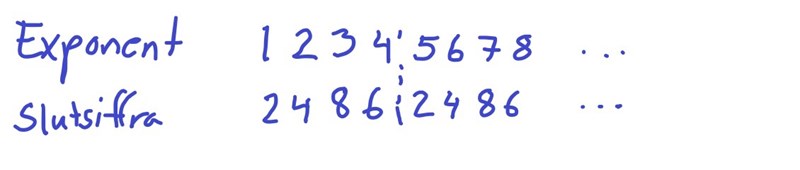 Helt rätt! Så var fjärde tal slutar på 2, var fjärde på 4, osv. Vi kan därför säga att alla tal på formen för något naturligt tal k (0, 1, 2, 3, ...) slutar på 2. Alla tal på formen slutar på 4. ger slutsiffran 8, och slutar på 6.