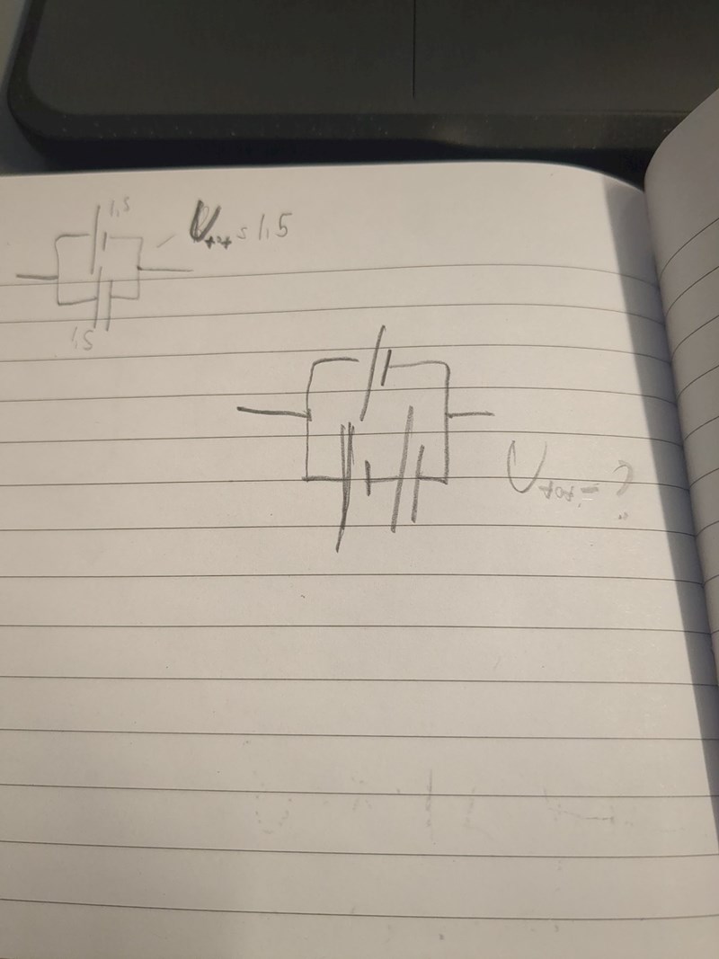 3V > 1,5V så det blir 3V och det övre batteriet påverkar inte spänningen Utot.