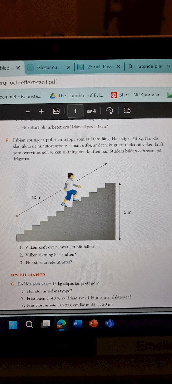 - i F3 så kommer man till massan m och sträckan h, men inte kraften längs med trappan.