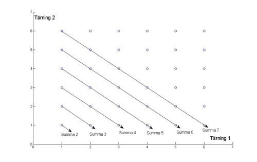 Exakt, då är det ju summan 7 som är vanligast, och den täcker 6/36 prickar.