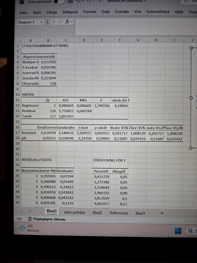 Har fått ett flik med 119 provpunkter där man jämförde pH och metallkoncentrationen i vatten.