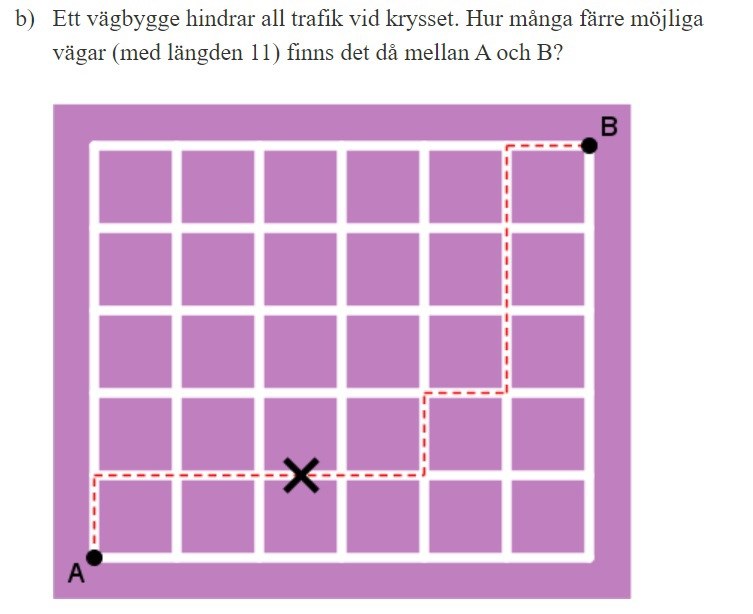 Jag förstår hur jag tar reda på hur många möjliga vägar det finns. Det finns ju totalt 11 val möjlighet. 5 uppåt och 6 åt höger. Utav 11 val måste 5 vara uppåt. de resterande 6 valen ska alla vara åt höger.