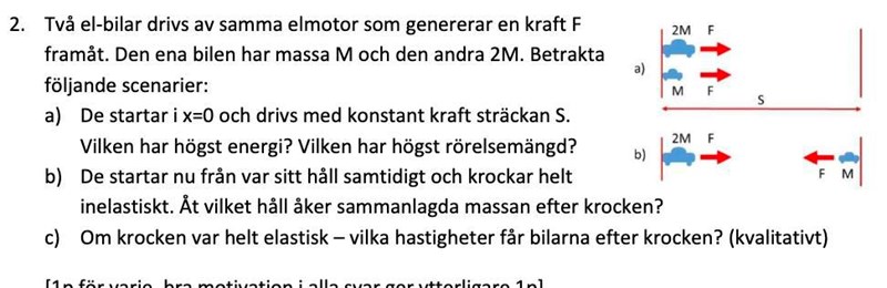 c) I facit står det att hastigheterna blir detsamma som innan krocken fast motriktade för att rörelsemängden ska bevaras. Får inte till hur det är möjligt. Den ena kan ha lägre hastighet medans den andra har högre efter krocken och rörelsemängden är fortfarande bevarad, varför måste de ha samma hastigheter?