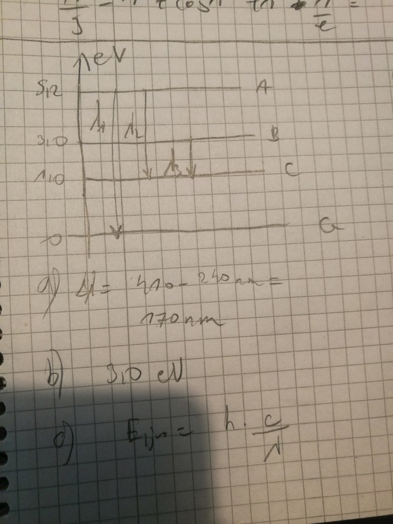 Börja med att räkna om våglängderna till frekvenser (energiskillnaderna mellan nivåerna är proportionella mot frekvenserna, inte mot våglängderna).