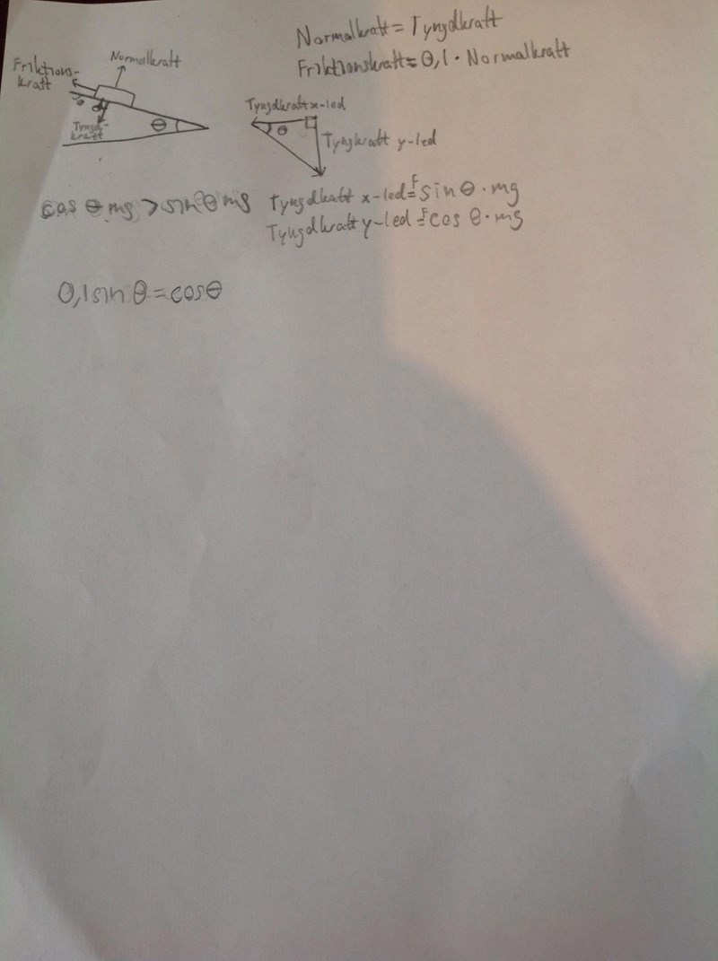 Smaragdalena skrev:Vad betyder dina beteckningar? Jag gissar att betyder normalkraften, men vad är det mer för krafter du har? och , vad betyder det? Hur stor är gravitationskraften? Har du ritat ut den? Kort sagt, du redovisar inte tillräckligt tydligt för att jag skall kunna följa med i hur du tänker.