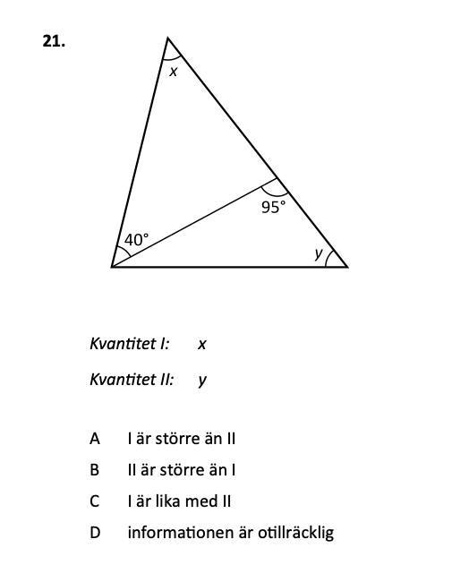 Sedan kan du kan titta på vinkeln "bredvid" 40°. Om du skulle rita den som 29° blir y=56°. Men om du ritar den som 31° blir y=54°. Båda funkar med figuren, och då kan du dra slutsatsen att du inte har tillräcklig information, dvs D.