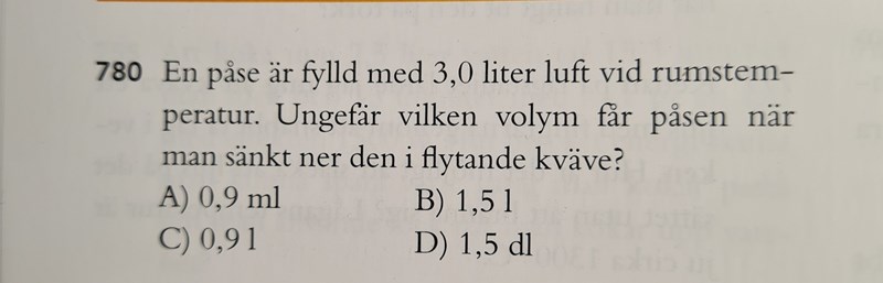 Om vätskor har ungefär 10^3 gånger mindre volym än gaser vid atmosfärstrycket, så innebär det att påsens volym blir cirka 3/1000 l när den sänks i flytande kväve. Det blir ungefär 3 ml. Facit säger att alternativ A) är det rätta svaret (0,9 ml). Men i uppgiften är de ute efter svaret på ett ungefär. Så din förklaring stämmer. Tack för hjälpen!