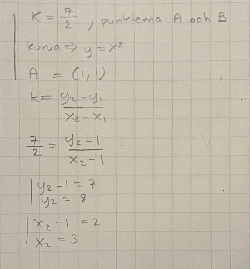 Felet är att du ur ekvationen 7/2 = (y2 – 1) / (x2 — 1) drar slutsatsen att y2 – 1 = 7 och x2 – 1 = 2.