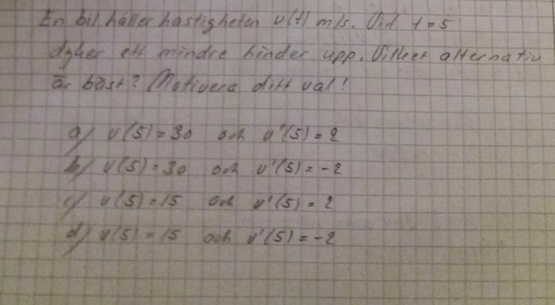 Det borde vara b eller d. Sen är ju frågan om uppgiften tycker båda svaren är möjliga; det beror väl lite på. Om man kör bil så är det kanske inte så troligt att man kör i hastigheten 15 km/h?