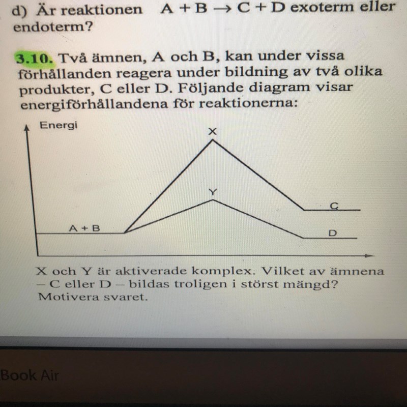 Teraeagle skrev :Det stämmer att det inte sker någon nettoproduktion eller konsumtion av reaktanter och produkter vid jämvikt, men man kommer nog att ha mer D även i det här fallet. Känner du till Gibbs fria energi? Det säger att reaktioner som ger en större sänkning av entalpin och större ökning av entropin är mer spontana. Du kan läsa av i diagrammet att energin (d.v.s. entalpin) faktiskt ökar när man bildar C, medan den sjunker något om man bildar D. Man kan uppskatta entropiändringen genom att se hur antalet partiklar ändras. I båda fallen tar vi två partiklar och bildar en, så entropiskillnaden bör vara ungefär lika stor (under antagandet att både C och D har samma aggregationstillstånd). Totalt sett innebär det att bildning av D är mer spontant och man kan förvänta sig att det bildas mer D jämfört med C när jämvikt har nåtts.