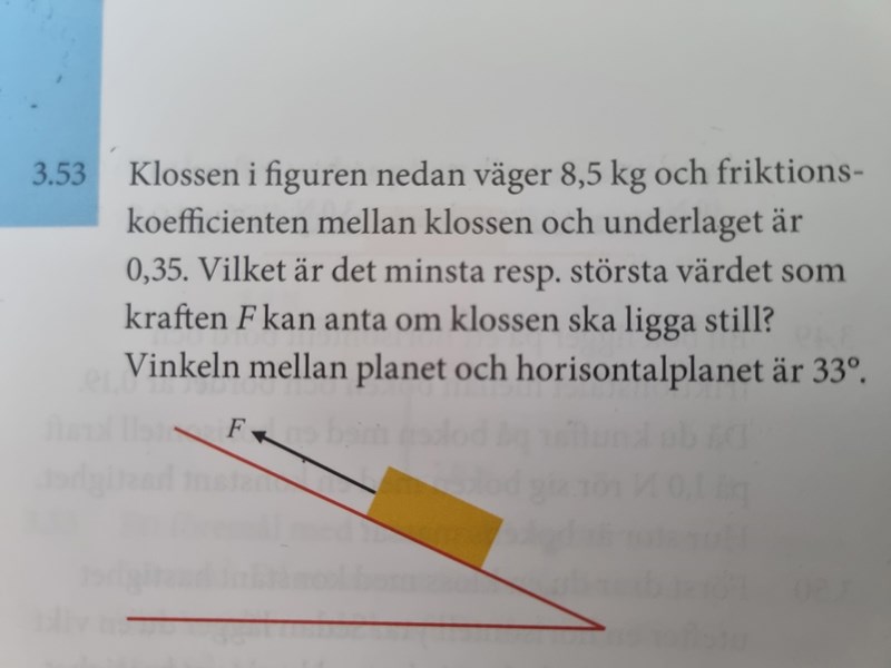 FN blir därför lika som tyngdkraftens komposant mot planet dvs mg*cos(33)
