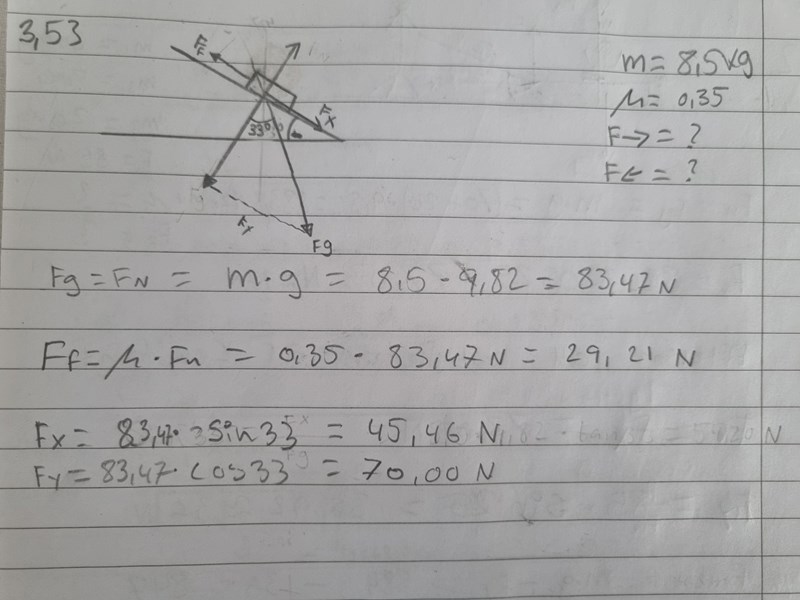 Sedan får man 21 N genom att ta F som pekar ner för den lutande underlaget minus totala friktionen som är motsatt riktning. F- Ff = (mg x sin 33) - 0,35 x 70 = 45,46 - 24,5 = 20,96 N ca 21N.