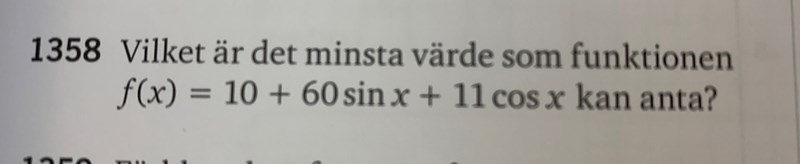 Att derivera? På vilket sätt tänkte du inom denna uppgift? Jag löste denna uppgift genom att: Roten ur (602 + 112), vilket blir 61. Det där är amplituden. Grafen är ju uppskjuten 10 längdenheter och har amplituden 61. Då kan man skriva 10 - 61 = -51, vilket är svaret