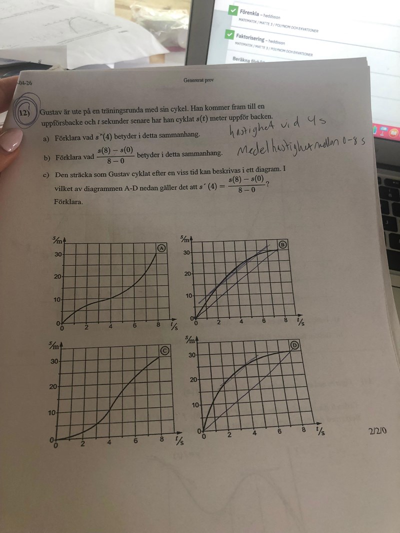 Smutstvätt skrev:Derivatan då x = 4 ska vara samma som lutningen hos en sekant som börjar då x = 0 och slutar då x = 8. Du har ritat in denna sekant i två av graferna, bra! Rita in sekanten i de övriga två graferna också. I vilken av graferna är sekanten parallell med grafen, då x = 4?