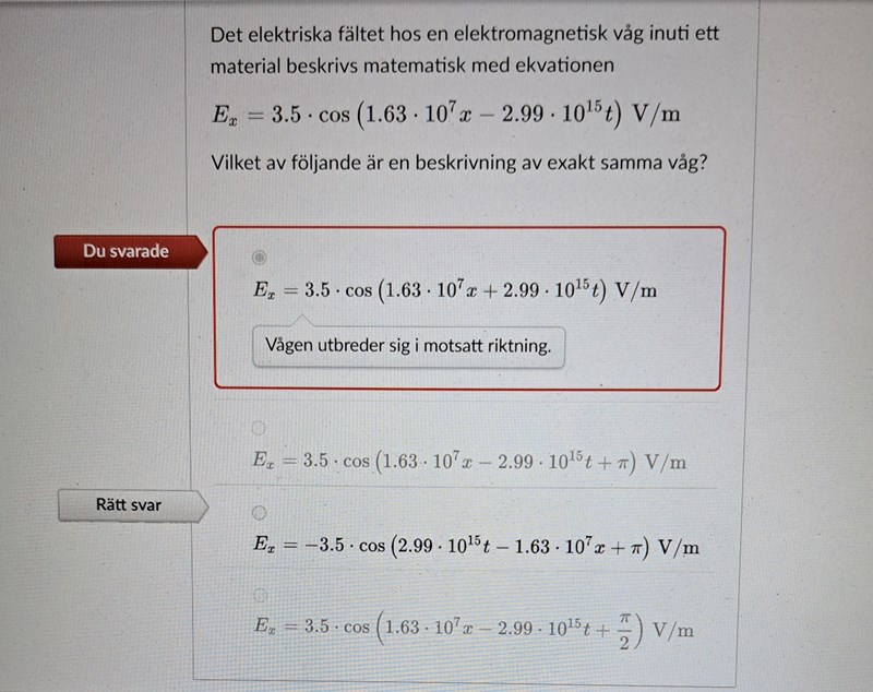Så cos(pi-v)=-cos(v)? I det här är fallet är v =2.99*10^15t-1.63*10^7x och cos(v)=cos(-v)