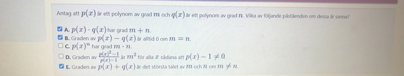 Pröva påstående B med de två polynomen p(x) = 4x2+1 och q(x) = 2x2+2.