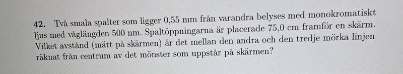 Ture skrev:Det står i uppgiften att man ska beräkna avståndet mellan andra och tredje mörka linjen, det ger tillräcklig upplysning för att beräkna n. se bild nedan