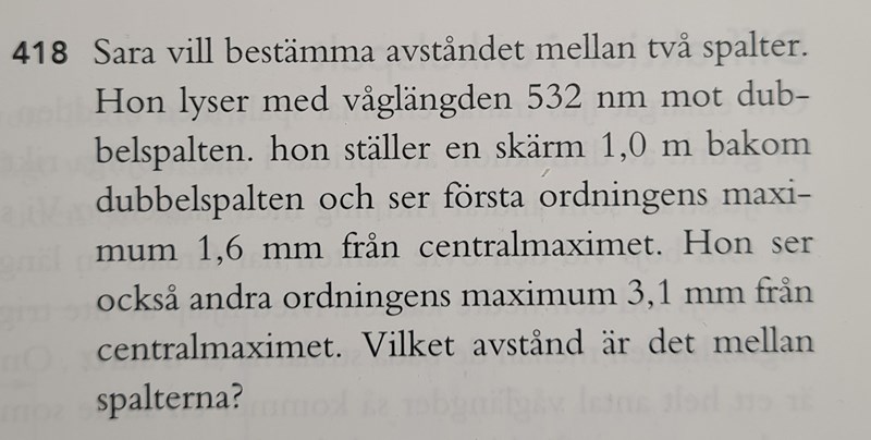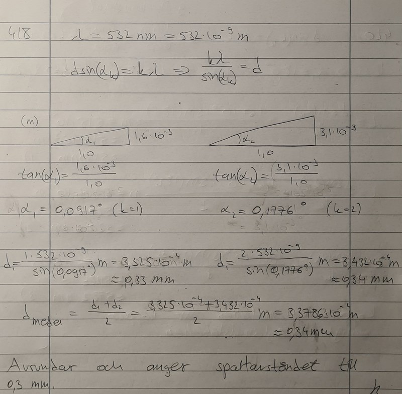 Här har jag beräknat medelavståndet mellan spalterna. Dvs jag har beräknat avståndet genom att sätta in värden för 1:a ordningens maximum och därefter upprepade jag samma sak genom att sätta in värden för 2:a ordningens maximum.