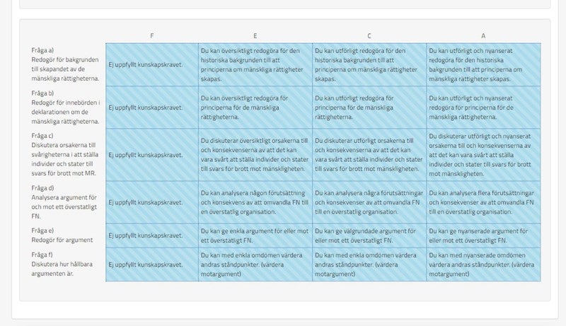 Så du menar att F-rutornabara skall fyllas i om man inte har uppnått någon av de andra betygen? Jag hade själv svårt att förstå dessa matriser med kunskapskrav när jag studerade min första kurs hos NTI i våras, alltså förstå vad läraren menade med sin ifyllning.