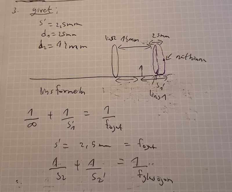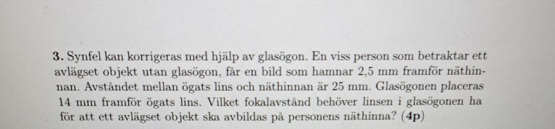 Jag vet att s2 borde bli oändligheten vilket ger oss bara en ekvation med 1/s2'=1/fglasögon men hur finner man s2' här? Min första beräkning handlar om att ta reda på ögats lins fokalavstånd först utan glasögon.