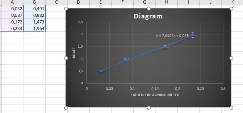 fick jag K=5. Nu min fråga vilken metod är bättre(mer noggran) att beräkna fjäderkonstanten med? kan det var den som hade en funktion som var mer lik rät linje när jag skapade ett diagram för varje metod?