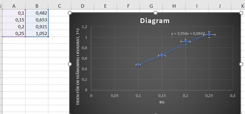 Andra metoden var att hänga de olika vikterna (var för sig och samma vikter som i metod 1) på fjäder sedan låta fjädern svänga upp o ner med varje vikt. och med varje vikt beräknade jag tiden för 10 svängningar sedan tiden för en svängning i kvadrat för att därefter göra ett diagram där lutning k skulle användas för att beräkna K genom då
