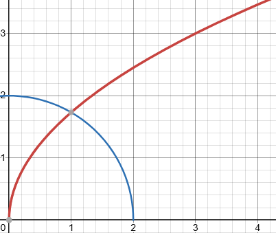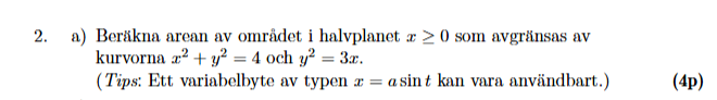 Jag är dock lite osäker på vilket område som avses. Jag har insett att den första kurvan är en cirkel med radie 2 men problemet är att när jag grafar för hand (och med Desmos) så finns det två områden som avgränsas i halvplanet x>=0: