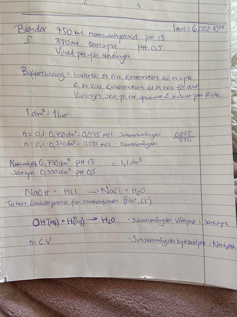 Du blandar 750 ml natriumhydroxid ph 13,0 & 350 ml saltsyra ph 0,5. Vilket ph värde får din blandning?