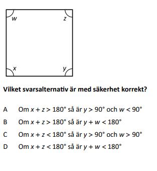 D: Om två vinklar är och två till vinklar är blir vinkelsumman totalt .Vilket svarsalternativ är rätt?