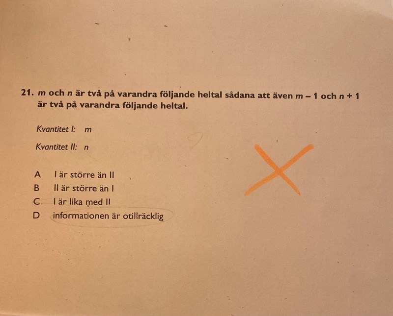 Jag tänkte först att ”m-1” är ekvivalent med ”m” och ”n+1” är ekvivalent med ”m+1” eftersom de är två på varandra följande heltal. Och sedan kan man mha ekvation beräkna ”n”. n=(m+1) som ger n=m och därför trodde jag att de båda kvantiteterna m och n var lika. Men sen kom jag på att det står i frågan att de är ”två på varandra följande tal” och då kan det inte stämma. Så jag har tänkt alldeles galet…