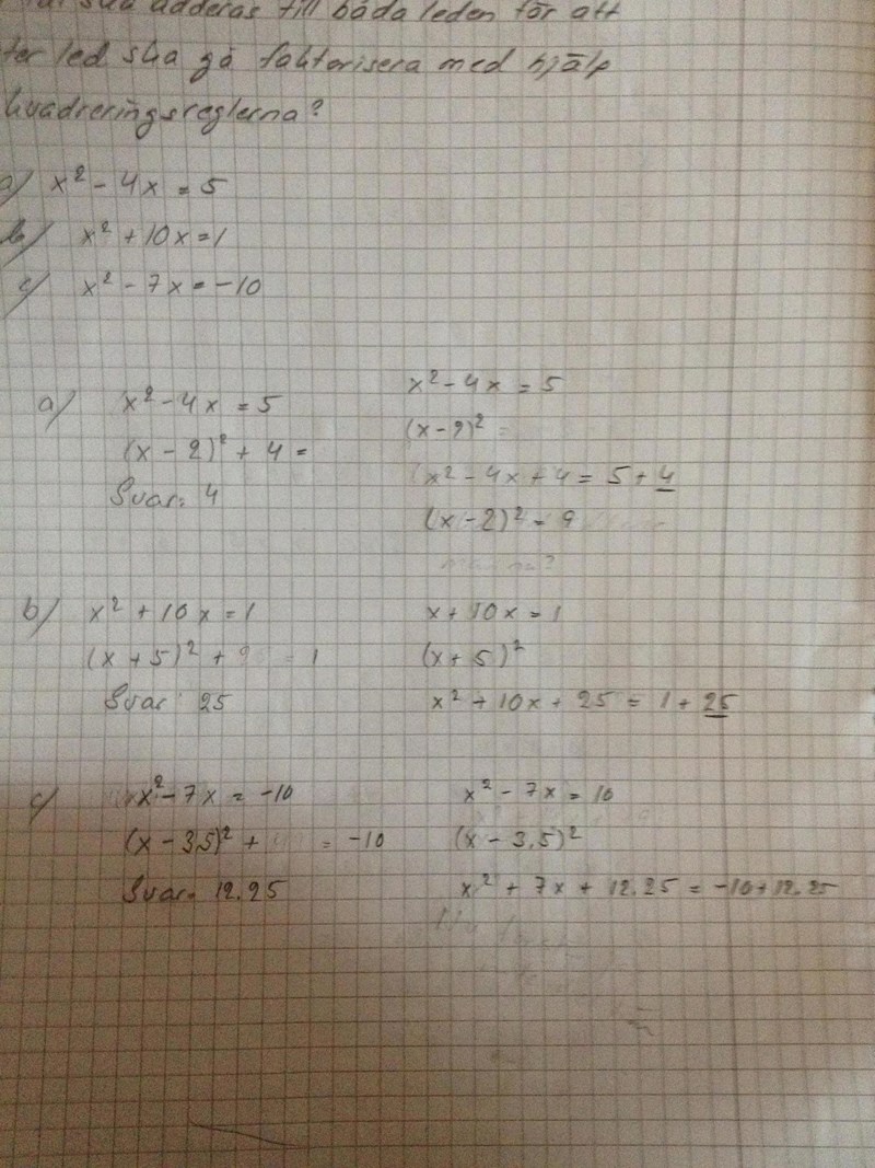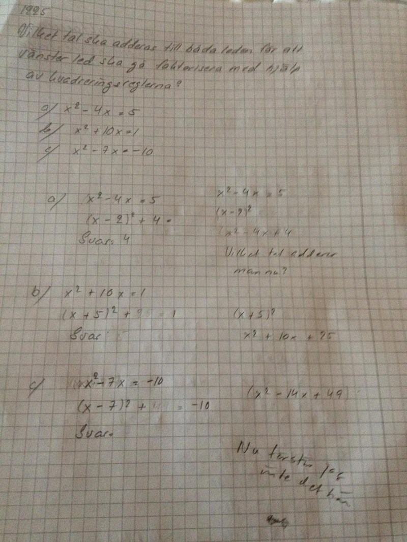 Jag brukar använda pq formeln. Därför hade jag glömt bort kvadrat kompletteringen. Man tycker att man klarar sig med den andra istället. När jag tittade på B boken, visst har haft den där. Man kommer ihåg kvadrerings regler och pq formeln. Det var nog så att jag hade glömt bort det. Nu vet jag hur detta går till.